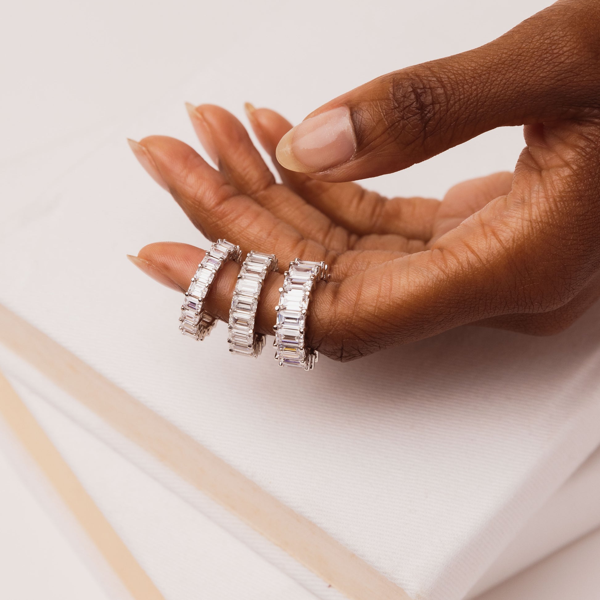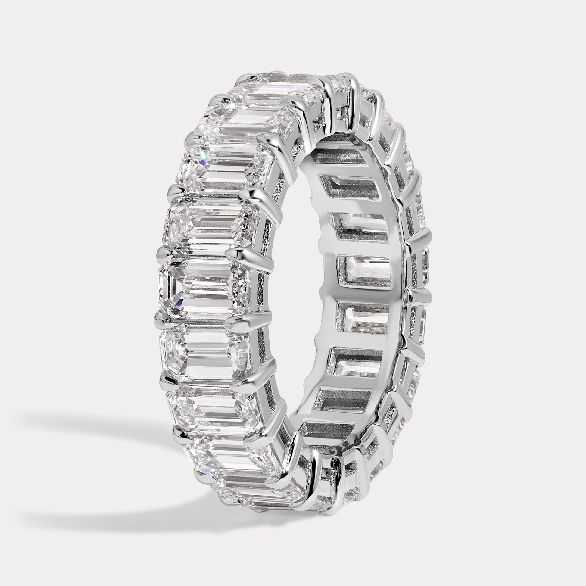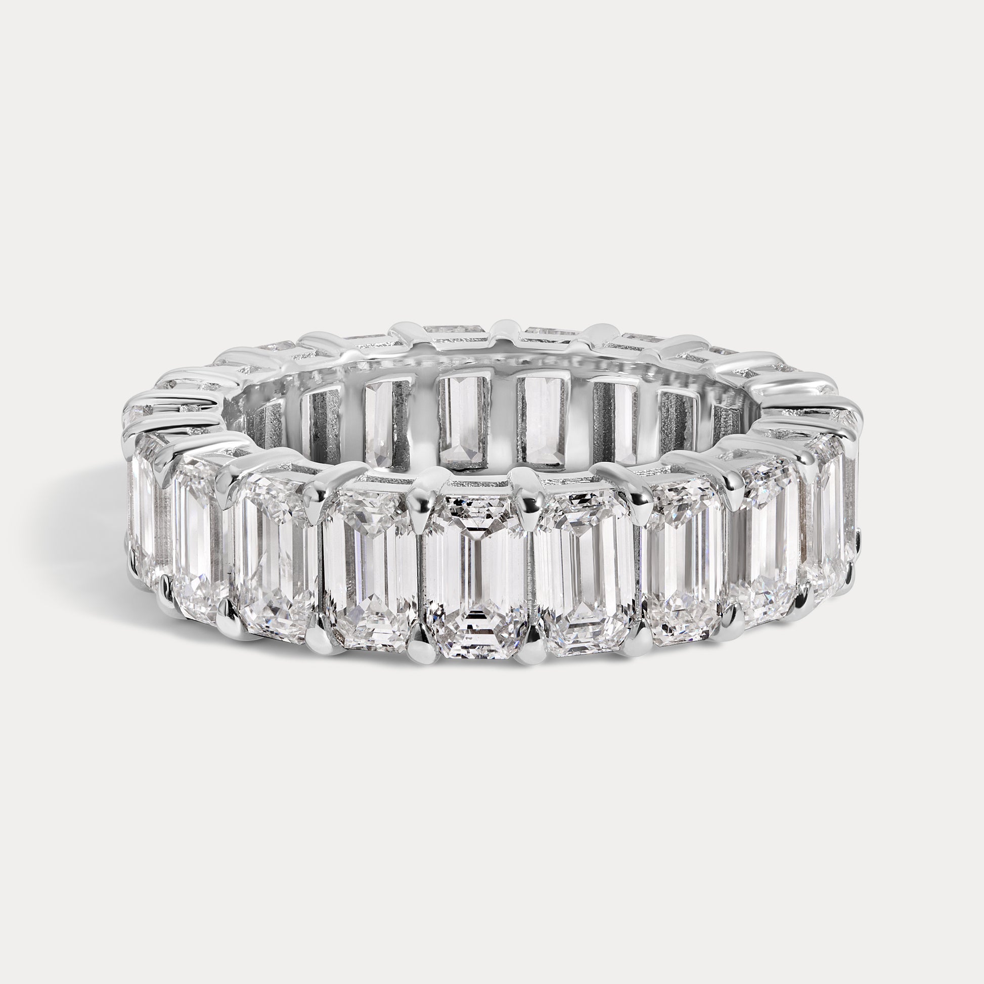Exquisite 6 carat eternity band featuring vertically-set emerald diamonds. Details provided below are for a size 6 ring.